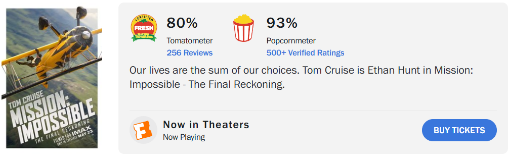 Apesar do início promissor, Missão Impossível – O Acerto Final enfrenta forte concorrência. O live-action de “Lilo & Stitch” da Disney, por exemplo, estreou com US$14 milhões em pré-estreias e a expectativa é que arrecade entre US$135 e US$165 milhões no mesmo período.